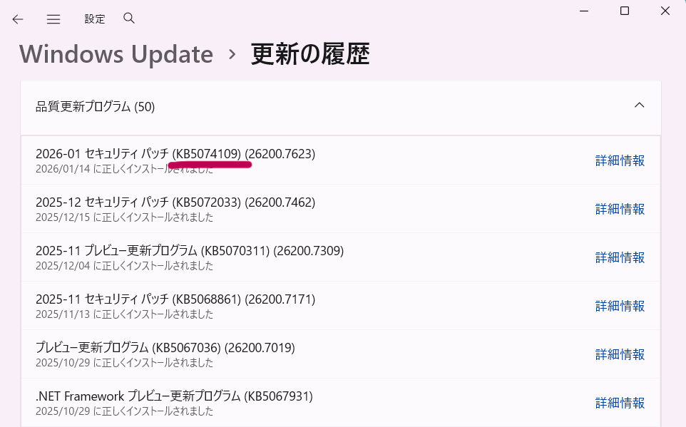 先日、1月14日にマイクロソフトから配信されたWindows 11向けのセキュリティ更新プログラム「KB5074109」。 皆さん、もう適用されましたか?